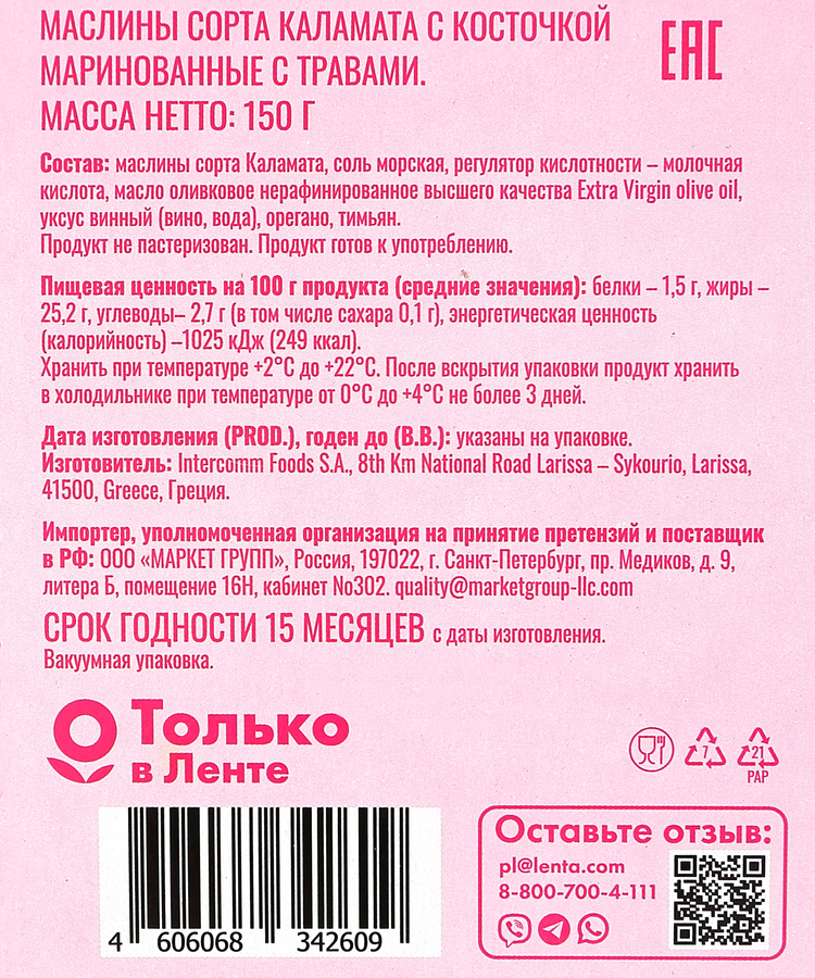 Маслины сорта Каламата, соль морская, регулятор кислотности – молочная кислота, масло оливковое Extra Virgin, винный уксус(виноматериалы), орегано, тимьян.