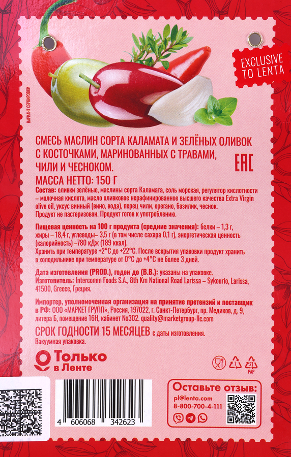 Оливки зеленые, маслины сорта Каламата, соль морская, регулятор кислотности: молочная кислота, масло оливковое Extra Virgin, винныйуксус, перец чили, орегано, базилик, чеснок.
