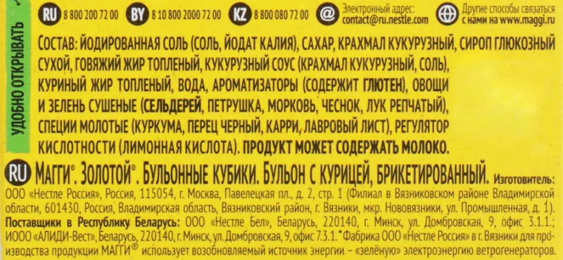 Йодированная соль (соль, йодат калия), крахмал кукурузный, сахар, сухой сироп глюкозы, говяжий жир топленый, кукурузный соус(крахмал кукурузный, соль), куриный жир топленый (2%), вода, ароматизаторы (курица), овощи и зелень сушеная (0,9%) (сельдерей,петрушка, морковь (0,1%), чеснок, лук репчатый), специи молотые (куркума, перец черный, карри, лавровый лист), регулятор кислотности(лимонная кислота), ароматизаторы (укроп, свежие травы).