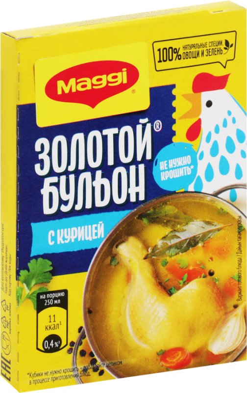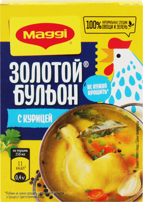 Бульон MAGGI Золотой с курицей в кубиках – это быстрый и простой способ приготовить домашний куриный суп. В каждом кубике идеально сочетаются букет специй, овощей, трав и соль. Благодаря MAGGI бульон приобретает насыщенный вкус и золотистый цвет. Продукт содержит натуральные овощи и зелень – сельдерей, петрушку, морковь, чеснок и лук, а также смесь молотых специй, которые придают блюду яркий вкус и аромат. Можно добавлять в бульон, в мясной фарш, к гарнирам и пасте.