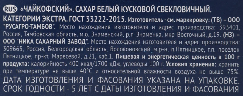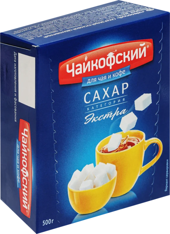 Сахар-рафинад ЧАЙКОФСКИЙ – пищевой продукт из группы углеводов, вырабатывается из свеклы. Углеводы обеспечивают функциональную деятельность человеческого организма и отвечают за производство энергии. Сыпучий продукт белого цвета. Используется в кулинарии, готов к употреблению. Быстро растворяется, не оставляет осадка, легко усваивается. Используется непосредственно в пищу, спрессован, разделен на кусочки.