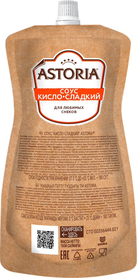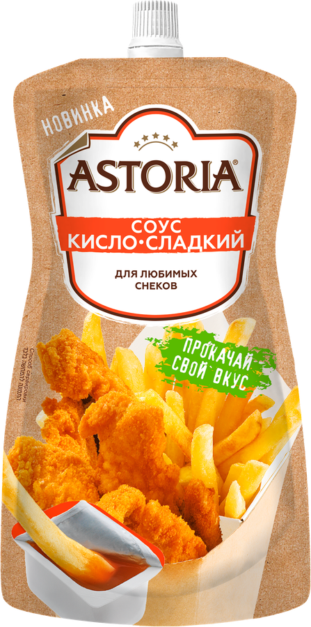 Соус АСТОРИЯ Кисло-сладкий. Продукт, который обладает пикантной и мягкой сладостью. Кисло-сладкий соус один из самых популярных соусов к снекам. Отлично сочетается с картофелем фри по-деревенски, креветкам в кляре, наггетсами, чипсами и сухариками.