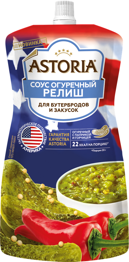 Соус АСТОРИЯ Релиш из маринованных огурцов – один из самых продаваемых соусов в Америке Наряду с кетчупом и горчицей является обязательным компонентом классического американского хот-дога. Великолепно подходит к сосискам, можно добавлять в домашние гамбургеры, сочетать с гарнирами, рыбными блюдами, бифштексами и постным мясом, как закуска – с крекерами и чипсами.