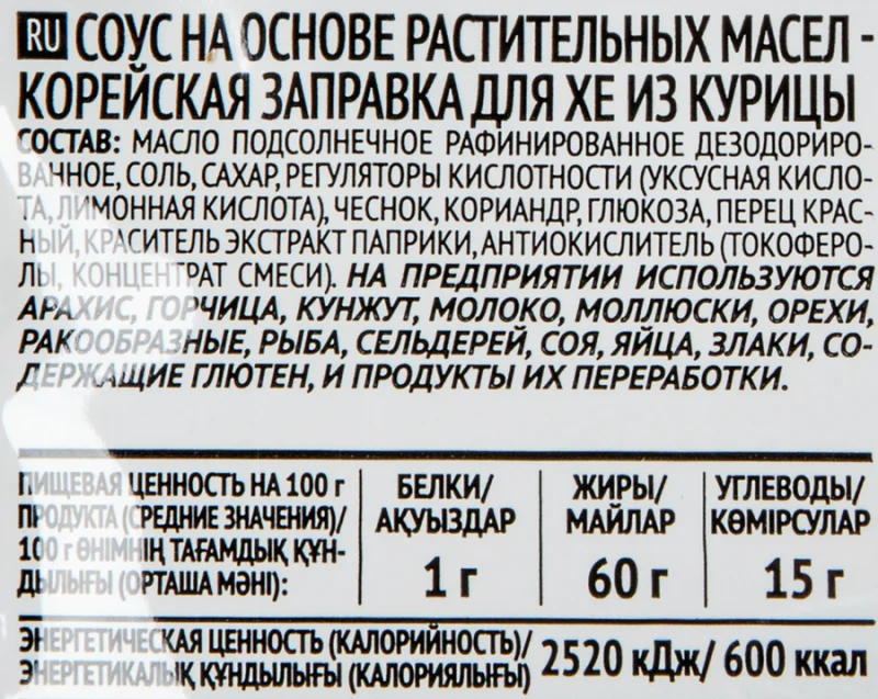 Масло подсолнечное, соль, сахар, чеснок, регуляторы кислотности – кислота уксусная, кислота лимонная, кориандр, декстроза, перецкрасный, краситель натуральный: экстракт паприки, усилитель вкуса и аромата: глутамат натрия, антиокислитель натуральный: токоферол.