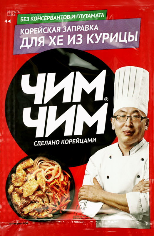 Корейская заправка ЧИМ-ЧИМ позволит быстро и легко приготовить хе из курицы. Продукт произведен на основе растительных масел, содержит уксус. Одного пакета заправки достаточно для 600г салата. На обратной стороне упаковки – рецепт приготовления хе из курицы.