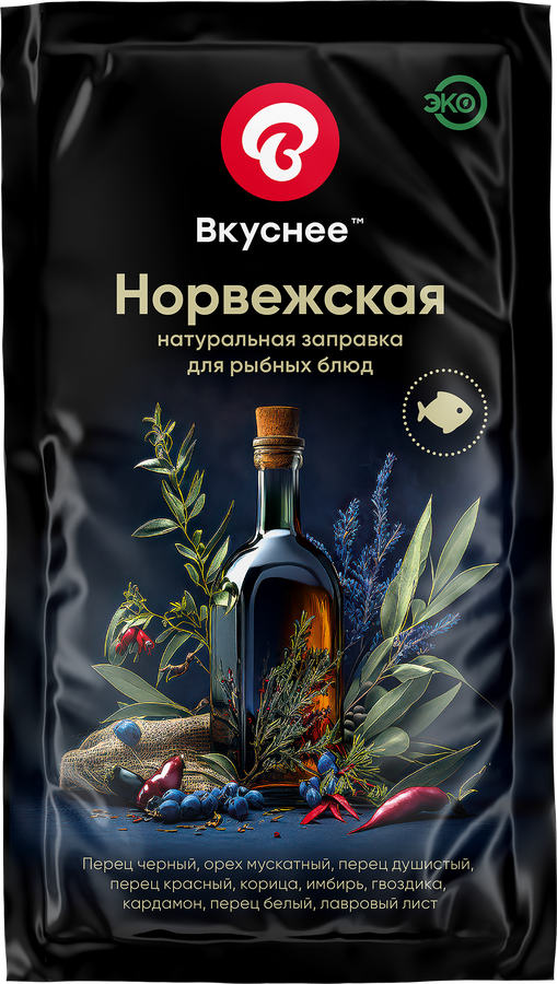 Заправка для рыбных блюд ВКУСНЕЕ Норвежская специально разработана, чтобы подчеркивать вкус рыбных блюд, добавляя им нотки свежести и аромата. Вдохновленная скандинавской кухней, она станет идеальным дополнением к лососю и другой рыбе.