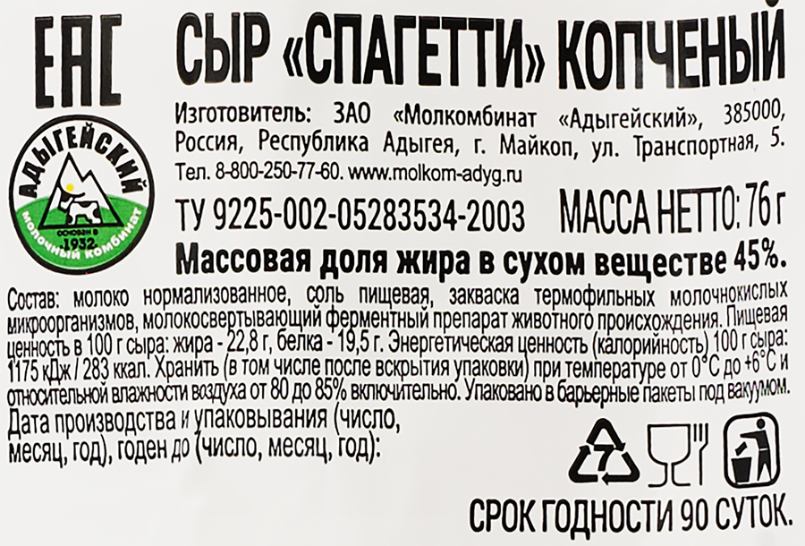 Сыр копченый МК АДЫГЕЙСКИЙ Спагетти 45%, без змж, 76г