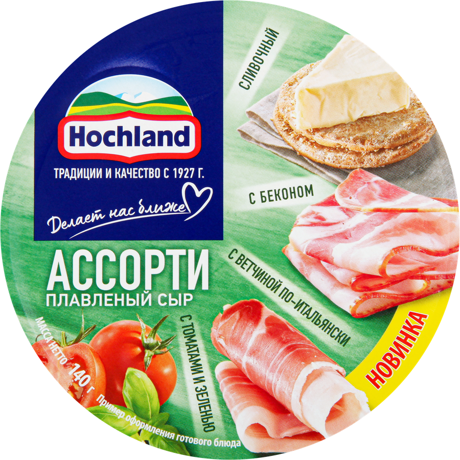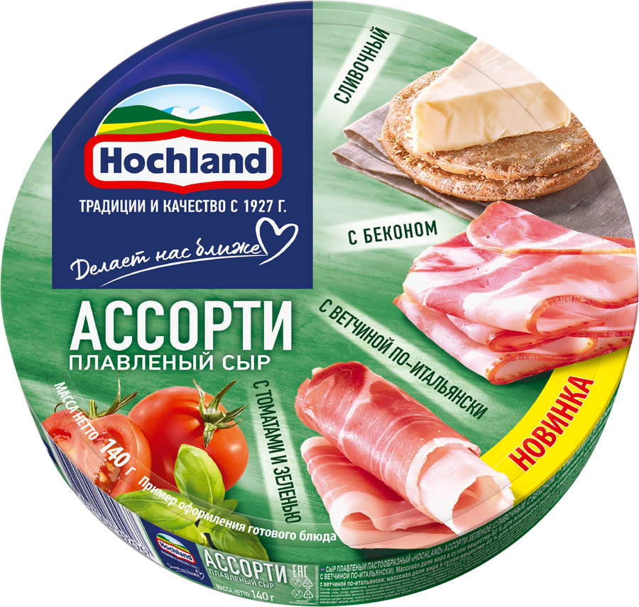 Сыр плавленый HOCHLAND Зеленое ассорти: сливочный, с беконом, с ветчиной по-итальянски, с томатами и зеленью, 50%/45% – это целых четыре вкуса в упаковке, которую удобно взять с собой! Ассорти удивит уникальными вкусами: сочетанием сыра с ветчиной по-итальянски, с ароматной зеленью и томатами; порадует любимым сливочным вкусом и ярким вкусом «с беконом». Он сделан из натурального полутвердого сыра, а крупные кусочки бекона, ветчины, томатов и зелени равномерно распределены внутри. Этот плавленый сыр идеально подходит как для бутербродов и перекусов, так и для приготовления горячих и холодных блюд. Его можно использовать для сэндвичей или вместо соуса в рулетах или салатах, в качестве начинки для хачапури или к пасте, а также в супах.