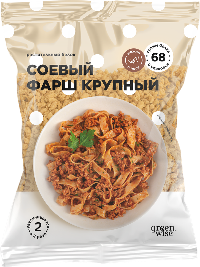 Фарш соевый GREENWISE Протекс-М крупный, из текстурированной соевой муки – текстурированный соевый белок. Он идеально подойдет для приготовления блюд с использованием фарша в качестве замены мяса: лазаньи, спагетти болоньезе, запеканок. Продукт широко известен как «соевое мясо». Соевый фарш легко готовить: достаточно замочить его в очень горячем, насыщенном специями бульоне на 1–2 минуты и хорошо отжать. Затем нужно обжарить соевый фарш до золотистой корочки и подать с гарниром или запечь с любимыми соусами. При приготовлении продукт увеличивается минимум в 2 раза. Соевый фарш произведен из российской сои и не содержит ГМО. Подходит для веганов. Кошерный и халяльный продукт.