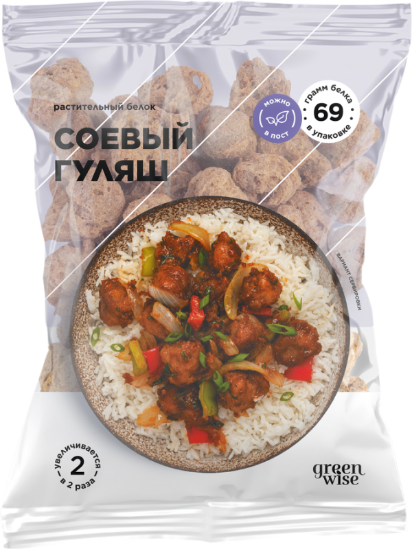Гуляш соевый GREENWISE Протекс-М, из текстурированной соевой муки – текстурированный соевый белок округлой формы. Он идеально подойдет для приготовления одноименного блюда в качестве замены мяса. Продукт широко известен как «соевое мясо». При приготовлении продукт увеличивается минимум в 2 раза. Соевый гуляш произведен из российской сои и не содержит ГМО. Подходит для веганов. Кошерный и халяльный продукт.