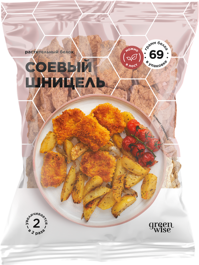 Шницель соевый GREENWISE Протекс-М, из текстурированной соевой муки – текстурированный соевый белок в форме плоских кусочков прямоугольной формы. Он идеально подойдет для приготовления одноименного блюда в качестве замены мяса. Продукт широко известен как «соевое мясо». Соевый шницель легко готовить: достаточно замочить его в очень горячем, насыщенном специями бульоне на 10 минут и хорошо отжать. Затем нужно обжарить соевые кусочки до золотистой корочки и подать с гарниром или запечь с любимыми соусами. При приготовлении продукт увеличивается минимум в 2 раза. Соевый шницель произведен из российской сои и не содержит ГМО. Подходит для веганов. Кошерный и халяльный продукт.
