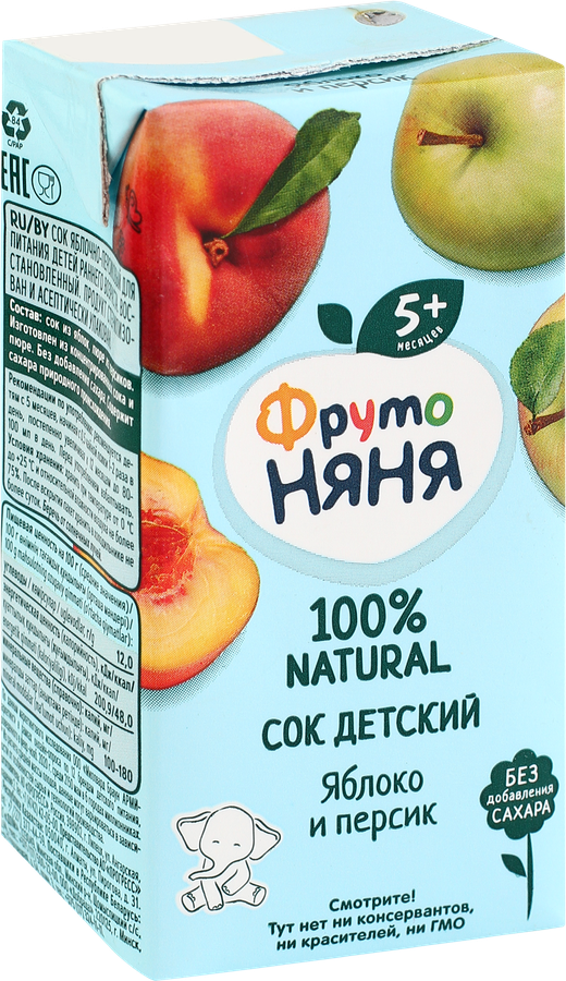 Сок из яблок и персиков ФРУТОНЯНЯ подарит малышу солнечное настроение. Ведь это яркое сочетание на 100% натурального сока спелых яблок и пюре из персиков. ФРУТОНЯНЯ сок из яблок и персиков поможет со вкусом и пользой разнообразить рацион ребенка старше 5 месяцев, чтобы он получал только натуральное для гармоничного роста и развития. Возьмите с собой в дорогу или на прогулку упаковку сока 200мл, чтобы малыш мог насладиться ярким вкусом в любое время.