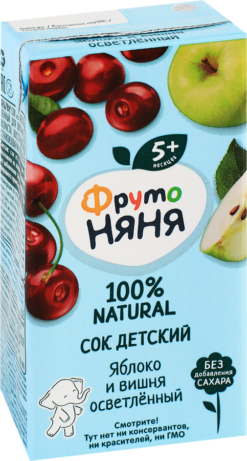 Сок ФРУТОНЯНЯ из яблока и вишни осветленный – отличный способ познакомить малыша старше 5 месяцев с новыми вкусами. В его составе только на 100% натуральные ингредиенты. Яблочно-вишневый сок ФРУТОНЯНЯ – отличный способ разнообразить привычное меню ребенка и зарядить его дополнительной энергией!