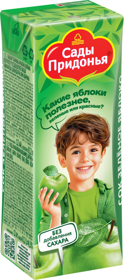 Сок САДЫ ПРИДОНЬЯ Зеленое яблоко полезен для укрепления иммунной и сердечно-сосудистой системы. Пектиновые вещества способствуют более легкому опорожнению кишечника и заживлению тканей. Сок способствует укреплению сна и улучшению настроения.