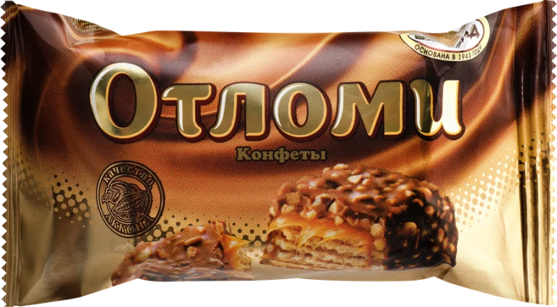 Конфеты АККОНД Отломи в глазури из молочного шоколада. Нежный вкус молочной и кремовой начинки дополнен мелкой арахисовой посыпкой и воздушным рисом.