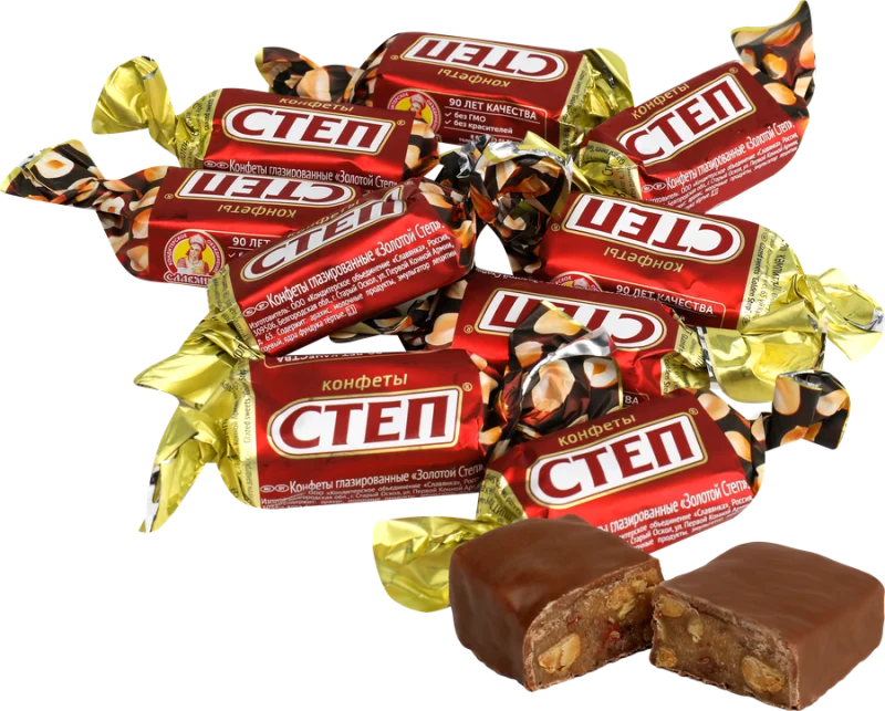 Конфеты СЛАВЯНКА Степ золотой – батончики с карамелью и кусочками орехов. Для производства используются натуральные ингредиенты высшего качества. Без искусственных красителей и ароматизаторов!