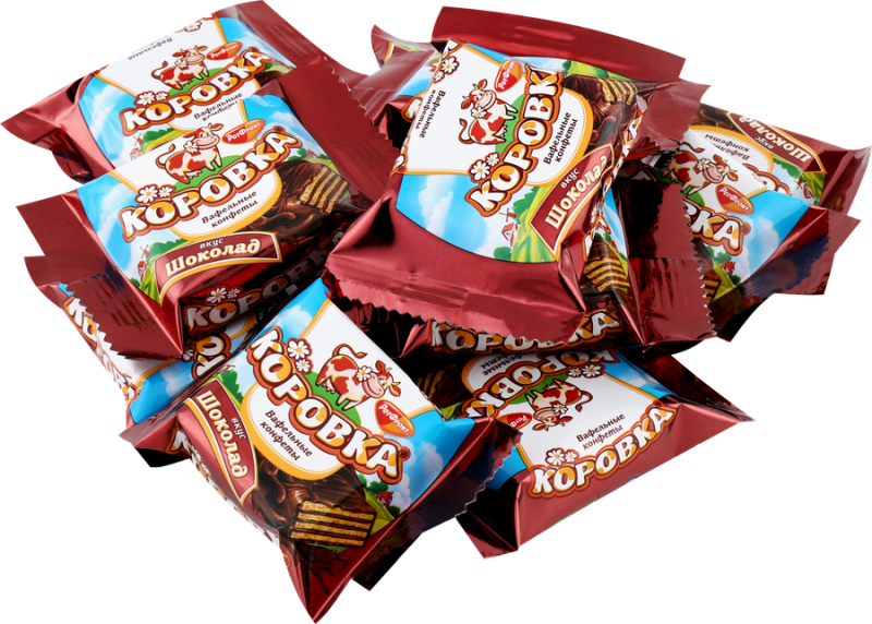 Конфеты вафельные РОТ ФРОНТ Коровка – хрустящие, тающие во рту конфеты из воздушных вафель с густым шоколадным кремом, покрытые шоколадной глазурью. Тонкая приятная горчинка шоколадного крема изысканно сочетается с рассыпчатой нежностью вафель и сливочным ароматом глазури.