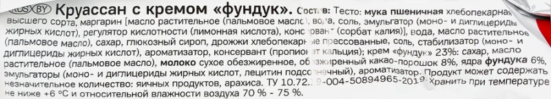 Тесто: мука пшеничная хлебопекарная высшего сорта, маргарин (масло растительное (пальмовое масло), вода, соль, эмульгатор (моно- идиглицериды жирных кислот), регулятор кислотности (лимонная кислота), консервант (сорьат калия)), вода, масло растительное(пальмовое масло), сахар, глюкозный сироп, дрожжи хлебопекарные прессованные, соль, стабилизатор (моно- и диглицериды жирныхкислот), ароматизатор, консервант (пропионат кальция); крем фундук 23%: сахар, масло растительное (пальмовое масло), молоко сухоеобезжиренное, обезжиренный какао-порошок 8%, ядра фундука 6%, эмульгаторы (моно- и диглицериды жирных кислот, лецитин подсолнечный),ароматизатор.