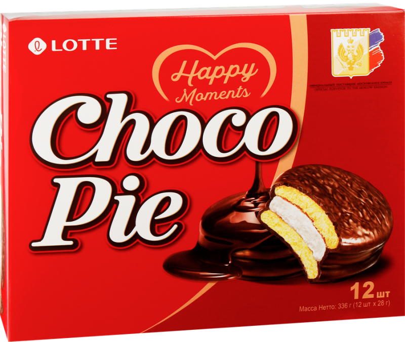 Печенье LOTTE Choco Pie – это бисквитное печенье в шоколадной глазури. В коробке 12 штук индивидуально упакованных печений.