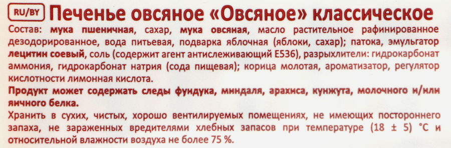 Мука пшеничная, сахар, мука овсяная, масло растительное рафинированное дезодорированное, вода питьевая, полуфабрикат яблочный (пюреяблочное, сахар, загуститель пектин, регулятор кислотности лимонная кислота), фундук, патока, эмульгатор лецитин соевый, соль,разрыхлители: гидрокарбонат аммония, гидрокарбонат натрия (сода пищевая), корица, ароматизаторы, регулятор кислотности лимоннаякислота.