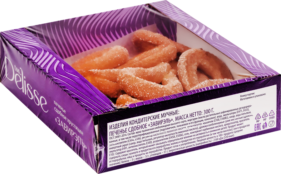 Печенье сдобное Завирэль от торговой марки DELISSE – великолепное дополнение к утреннему кофе или бодрящему ароматному чаю. Оно готовится из нежнейшего сдобного теста по авторскому десерту. Завирэль гарантированно подарит заряд бодрости и отличное настроение всем без исключения.