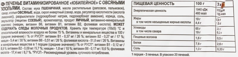 Печенье Витаминизированное с овсяными хлопьями от бренда ЮБИЛЕЙНОЕ – это то самое печенье, которое окунет в детство. Сладкое витаминизированное молочное печенье идеально дополнит завтрак или обед, прекрасно подойдет в качестве перекуса к чаю или кофе. Станет чудесным угощеньем на праздничном столе или на пикнике.