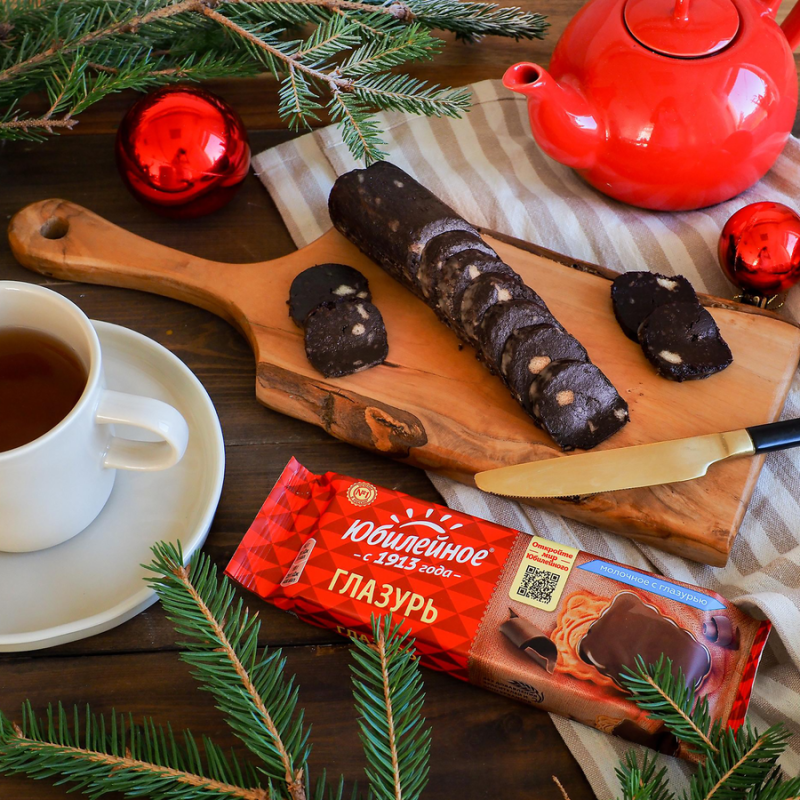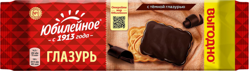 Печенье ЮБИЛЕЙНОЕ Витаминизированное с глазурью ‒ это то самое печенье со 110 летней историей, которое окунет в детство. Нежная темная шоколадная глазурь на сладком витаминизированном печенье будет прекрасным вкусным десертом на праздничном столе или пикнике, отлично подойдет в качестве полезного перекуса на прогулке, университете или школе, станет идеальной парой к чаю, кофе, соку или молоку.