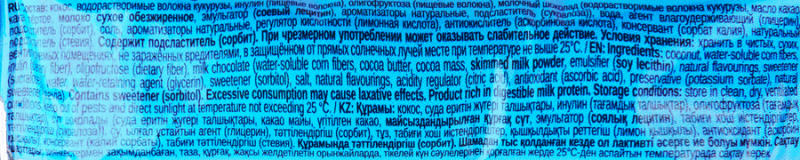 Кокос, водорастворимые волокна кукурузы, инулин (пищевые волокна), олигофруктоза (пищевые волокна), молочный шоколад(водорастворимые волокна кукурузы, масло какао, какао тертое, молоко сухое обезжиренное, эмульгатор (соевый лецитин), ароматизаторынатуральные, подсластитель (сукралоза)), вода, агенты влагоудерживающие (глицерин, сорбит), соль, ароматизаторы натуральные,регулятор кислотности (лимонная кислота), антиокислитель (аскорбиновая кислота), консервант (сорбат калия), натуральныйподсластитель (стевия).