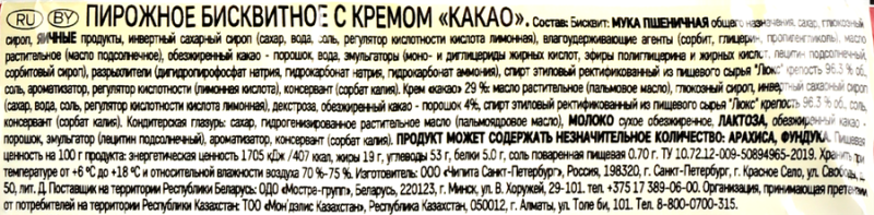 Бисквит: мука пшеничная общего назначения, сахар, глюкозный сироп, яичные продукты, инвертный сахарный сироп (сахар, вода питьевая,соль, регулятор кислотности кислота лимонная), влагоудерживающие агенты (сорбит, глицерин, пропиленгликоль), масло растительное(масло подсолнечное), обезжиренный какао-порошок, вода, эмульгаторы (моно- и диглицериды жирных кислот, эфиры полиглицерина и жирныхкислот, лецитин подсолнечный, сорбитовый сироп), разрыхлители (дигидропирофосфат натрия, гидрокарбонат натрия, гидрокарбонатаммония), спирт этиловый ректификованный из пищевого сырья Люкс крепость 96,3% об., соль, ароматизатор, регулятор кислотности(лимонная кислота), консервант (сорбат калия). Крем какао 29%: масло растительное (пальмовое масло), глюкозный сироп, инвертныйсахарный сироп (сахар, вода, соль, регулятор кислотности кислота лимонная), декстроза, обезжиренный какао-порошок 4%, спирт этиловыйректификованный из пищевого сырья Люкс крепость 96,3% об., соль, консервант (сорбат калия). Кондитерская глазурь: сахар,гидрогенизированное растительное масло (пальмоядровое масло), молоко сухое обезжиренное, лактоза, обезжиренный какао-порошок,эмульгатор (лецитин подсолнечный), ароматизатор, консервант (сорбат калия).