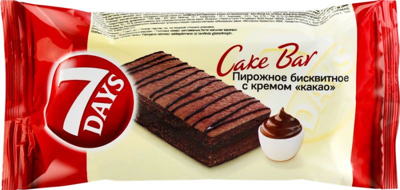 Пирожное бисквитное 7DAYS Cake Bar с начинкой из крема Какао. Продается в индивидуальной упаковке. Для производства используются только натуральные ингредиенты высшего качества.