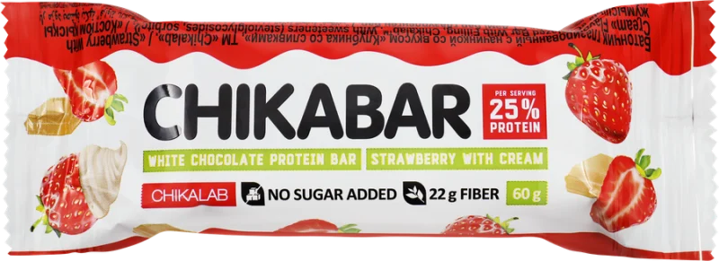 Батончик протеиновый CHIKALAB с начинкой клубника со сливками, глазированный – полезное и аппетитное лакомство, которое поможет быстро утолить голод и пополнить запасы энергии. Его можно употреблять в качестве десерта с чаем или кофе, использовать для перекуса во время прогулки или долгой поездки. Батончик покрыт слоем нежного молочного шоколада, что придет дополнительную выразительность его вкусу.