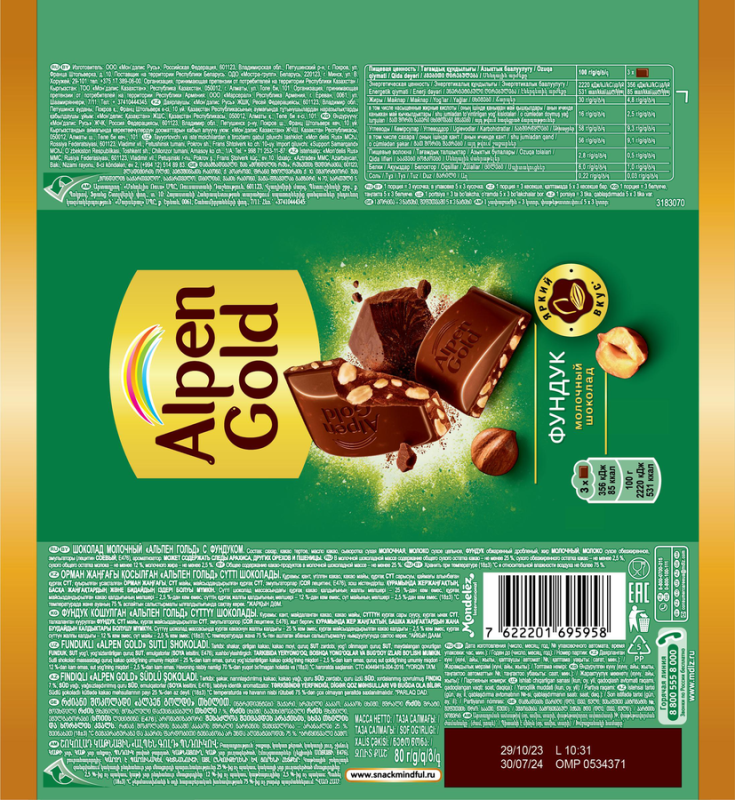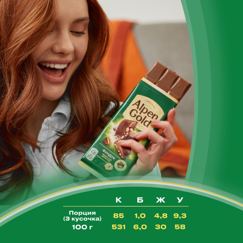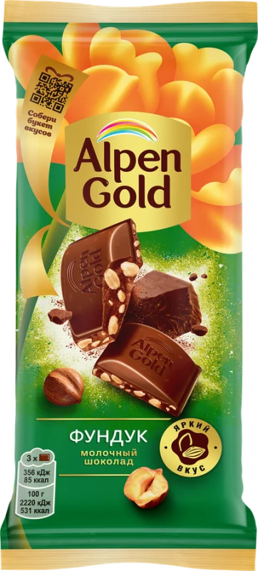 Создайте настроение по вкусу вместе с ALPEN GOLD! ALPEN GOLD уже более 25 лет радует ценителей шоколада необычными вкусовыми сочетаниями. В широком ассортименте Alpen Gold представлены как классические вкусы молочного, темного и белого шоколада, так и неординарные вкусовые миксы: каждый любитель сладкого найдет среди них что-нибудь для себя. Молочный шоколад ALPEN GOLD с фундуком ‒ один из любимых многими классических вкусовых миксов, в котором сочетаются нежная текстура шоколада, легкое похрустывание фундука и приятное ореховое послевкусие. Шоколад ALPEN GOLD производится по высоким стандартам качества из натуральных какао-продуктов, заряжает ярким настроением и приглашает к вкусным открытиям. Шоколад с фундуком ALPEN GOLD в компактной упаковке легко взять с собой куда угодно: на работу, учебу, в поездку или в гости к чаю. Плитка шоколада ALPEN GOLD ‒ это простой способ сделать свой день ярче и веселее, получая сладкое удовольствие от каждого кусочка, которым можно поделиться с друзьями и близкими людьми!