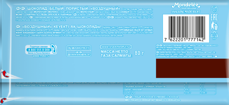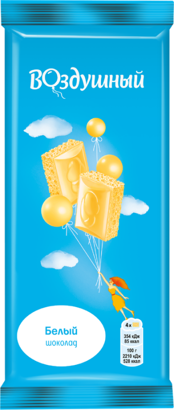 Шоколад белый ВОЗДУШНЫЙ ‒ пористый шоколад с невесомой текстурой, вкус которого раскрывается тысячей шоколадных пузырьков. Каждая долька белого шоколада тает во рту и оставляет приятное сливочное послевкусие, наполняя жизнь легким и беззаботным настроением! Шоколад белый молочный идеально дополнит любимые напитки и подойдет для быстрого перекуса. Выделите минутку на себя, возьмите шоколадку для продуктивного дня. Или наслаждайтесь шоколадом в плитке, не отрываясь от дел, ‒ с чашечкой кофе или чая. Шоколад в удобной упаковке можно взять с собой в гости, на работу и учебу, а также оставить на вечер, чтобы побаловать себя сладостями к чаю. Белый молочный шоколад с воздушной текстурой также можно преподнести в подарок ‒ на праздник или без повода. Наслаждайтесь любимым вкусом пористого белого шоколада и дарите приятные эмоции близким!