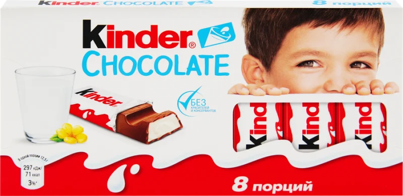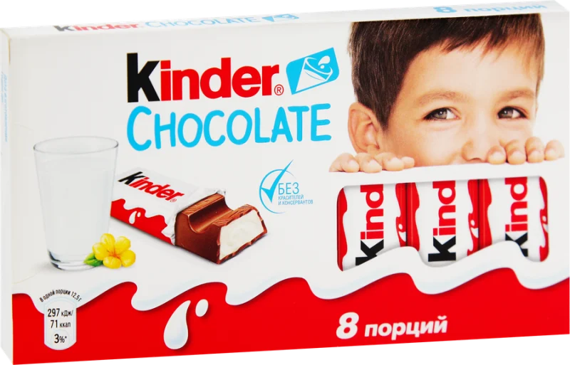 Шоколад KINDER Chocolate с молочной начинкой – нежное изысканное лакомство для детей и взрослых. Насыщенный вкус молока и шоколада в каждой плитке. В подарочной упаковке 8 мини-плиток. Используется как десерт, перекус.