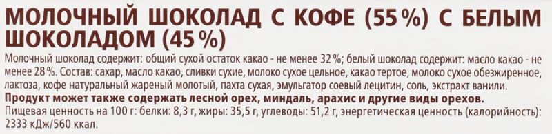 Сахар, масло какао, сливки сухие, молоко сухое цельное, какао тертое, молоко сухое обезжиренное, подсырная сухая молочная сыворотка,лактоза, кофе натуральный жареный молотый, пахта сухая, эмульгатор: соевый лецитин, соль, экстракт ванили. Может содержать частицылесных орехов, миндаля, арахиса и прочих орехов.