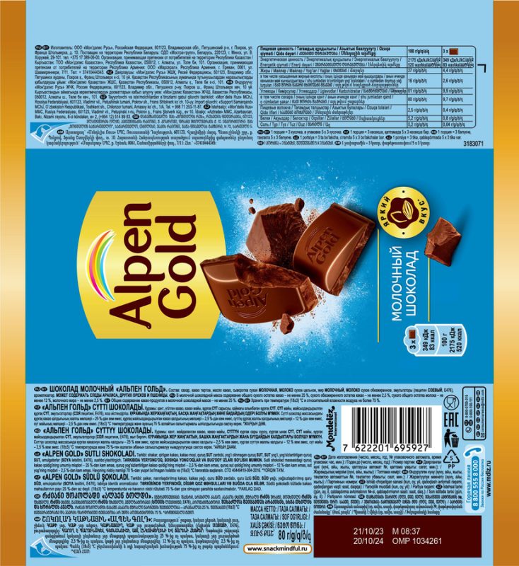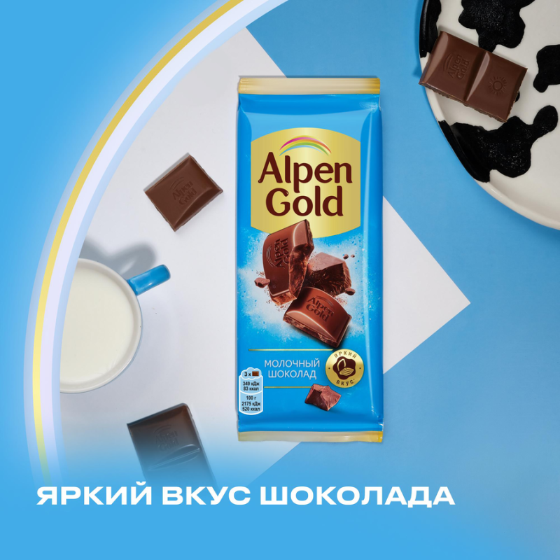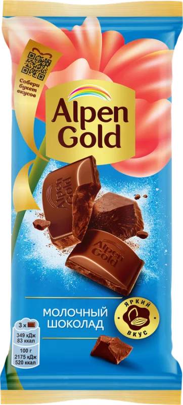 Создайте настроение по вкусу вместе с ALPEN GOLD! Alpen Gold уже более 25 лет радует ценителей шоколада необычными вкусовыми сочетаниями. В широком ассортименте ALPEN GOLD представлены как классические вкусы молочного, темного и белого шоколада, так и неординарные вкусовые миксы: каждый любитель сладкого найдет среди них что-нибудь для себя. Молочный шоколад ALPEN GOLD ‒ это неизменно популярный классический вкус: нежный, умеренно сладкий, буквально тающий во рту. Шоколад ALPEN GOLD производится по высоким стандартам качества из натуральных какао-продуктов, заряжает ярким настроением и приглашает к вкусным открытиям. Плитка шоколада ALPEN GOLD ‒ это не только сладкое удовольствие в каждом кусочке, а еще и простой способ сделать свой день ярче и веселее! Благодаря компактной упаковке шоколад молочный ALPEN GOLD удобно брать с собой на работу, учебу, в поездку или разделить радость вкуса с самыми родными и близкими людьми!