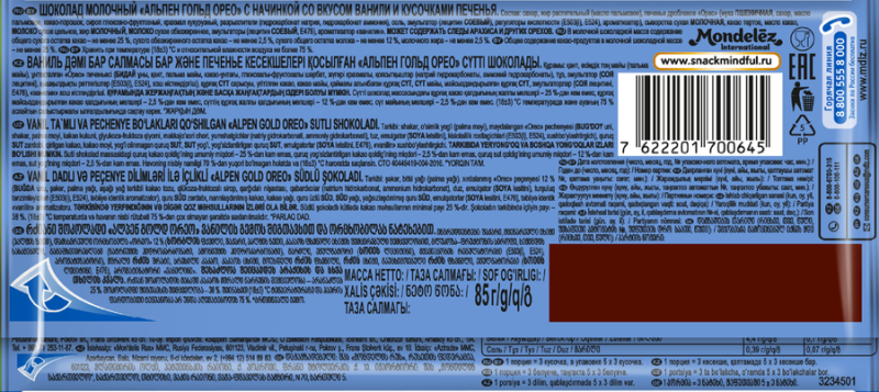 Сахар, какао тертое, печенье дробленое Орео (мука пшеничная, сахар, масло пальмовое, какао-порошок, сироп глюкозно-фруктозный,крахмал кукурузный, разрыхлители (гидрокарбонат натрия, гидрокарбонат аммония), соль, эмульгатор (лецитин соевый), регуляторыкислотности (E503 (i), E524), ароматизатор), сыворотка сухая молочная, жир растительный (пальмовое масло), масло какао, какаотертое, масло какао, молоко сухое цельное, жир молочный, молоко сухое обезжиренное, эмульгаторы (лецитин соевый, E476) ароматизатор.В молочной шоколадной массе содержание общего сухого остатка какао – не менее 25%, сухого обезжиренного остатка какао – не менее2,5%, сухого общего остатка молока – не мене 12%, молочного жира – не менее 2,5%.
