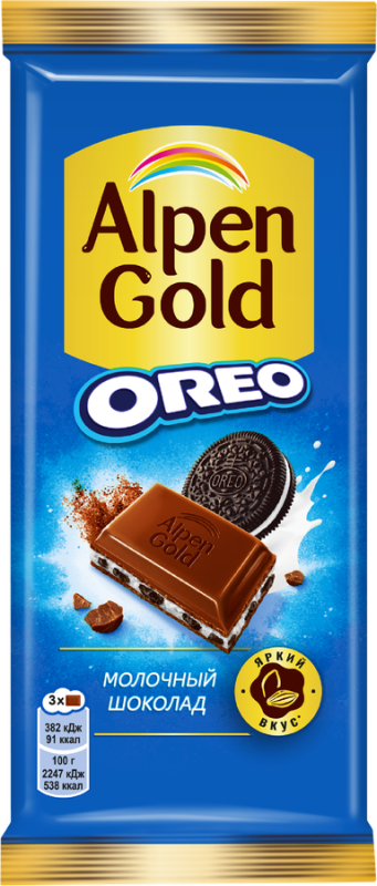 Шоколад молочный ALPEN GOLD Орео со вкусом ванили и кусочками печенья, 85г