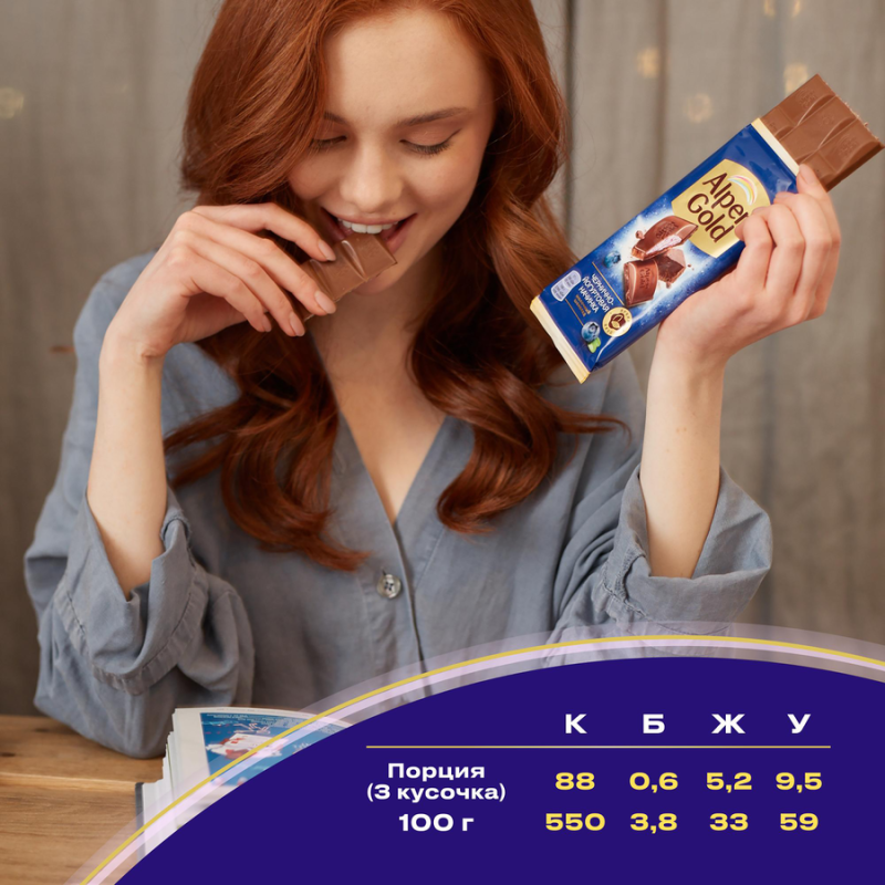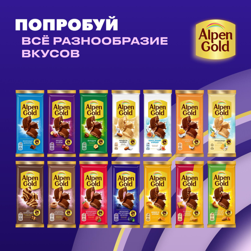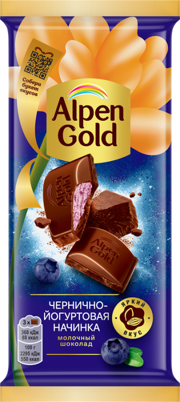 Создайте настроение по вкусу вместе с ALPEN GOLD! ALPEN GOLD уже более 25 лет радует ценителей шоколада необычными вкусовыми сочетаниями. В широком ассортименте ALPEN GOLD представлены как классические вкусы молочного, темного и белого шоколада, так и неординарные вкусовые миксы: каждый любитель сладкого найдет среди них что-нибудь для себя. Шоколад молочный ALPEN GOLD с чернично-йогуртовой начинкой ‒ это сочетание яркого черничного и нежного шоколадного вкусов в мягкой, тающей во рту текстуре. Шоколад ALPEN GOLD производится по высоким стандартам качества из натуральных какао-продуктов, заряжает ярким настроением и приглашает к вкусным открытиям. Шоколад с начинкой ALPEN GOLD в компактной упаковке можно взять с собой на работу, учебу, в поездку или в гости к чаю. Плитка шоколада ALPEN GOLD ‒ это сладкое удовольствие в каждом кусочке. А еще ‒ простой способ сделать свой день ярче и веселее, и поделиться радостью с друзьями и близкими людьми!