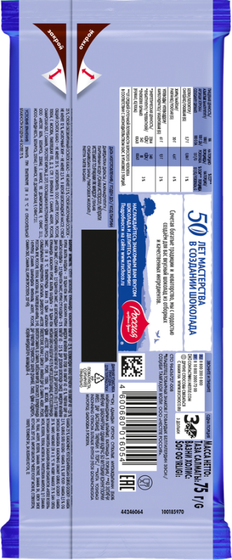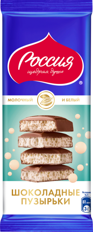 Шоколад молочный и белый РОССИЯ ЩЕДРАЯ ДУША пористый – качественный шоколад с воздушными пузырьками нежного молочного и изысканного белого шоколада и притягательным вкусом ванили. Тающий вкус пористого молочного шоколада и нежных воздушных пузырьков в одной плитке.