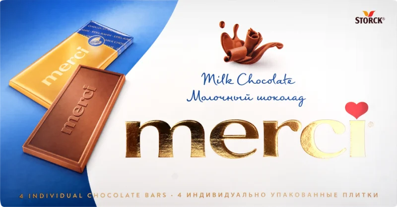 MERCI – это изысканное сочетание различных сортов шоколада в индивидуальной упаковке из золотой фольги. Появившись в Германии в 1965 году, бренд MERCI сразу нашел путь к сердцам людей, став первым шоколадом, с помощью которого можно выразить особую благодарность. MERCI шоколадные плитки – это шоколад высочайшего немецкого качества и потрясающего вкуса. Оригинальная упаковка в виде конверта содержит четыре изящных индивидуально упакованных плиточки шоколада.