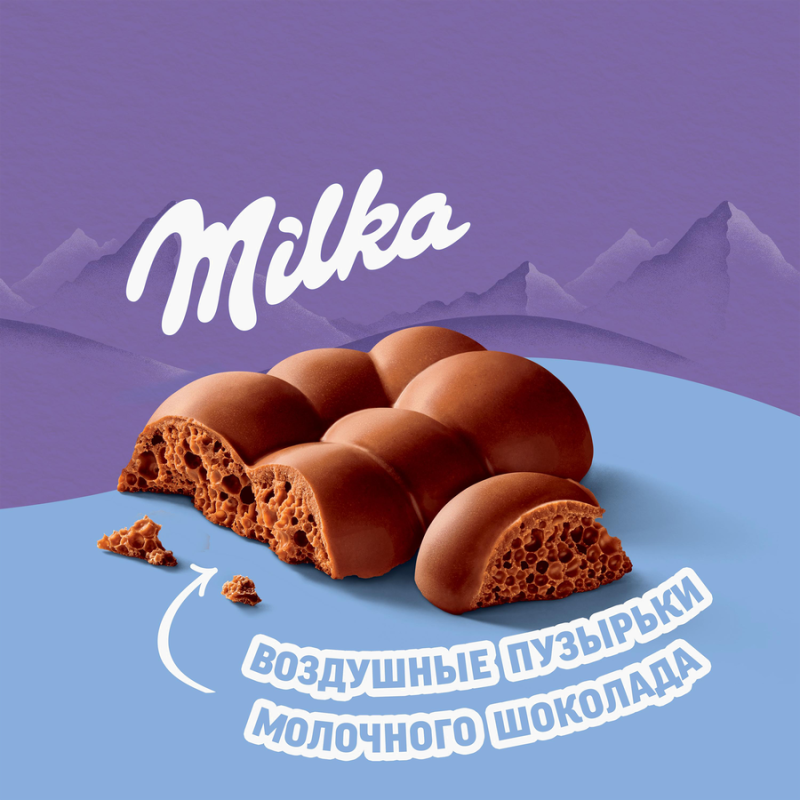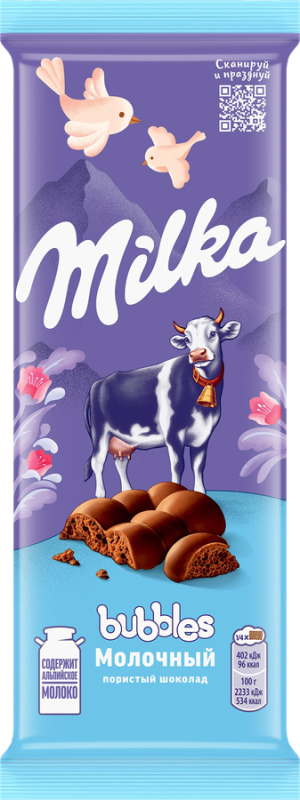 Шоколад молочный MILKA Bubbles Пористый ‒ это невероятно легкая текстура молочного шоколада, нежный вкус которого раскрывается тысячами воздушных пузырьков. Невероятно тонкий и нежный микс, который подарит море приятных эмоций в любой день! Пористый шоколад MILKA Bubbles изготовлен из какао высокого качества с добавлением настоящего альпийского молока: поэтому он такой нежный и буквально тает во рту. Молочный шоколад MILKA Bubbles подходит не только к чаю или кофе: его можно взять с собой на работу, учебу, в поездку или насладиться нежным вкусом за просмотром любимого фильма. Дарите друг другу нежность вместе с MILKA!