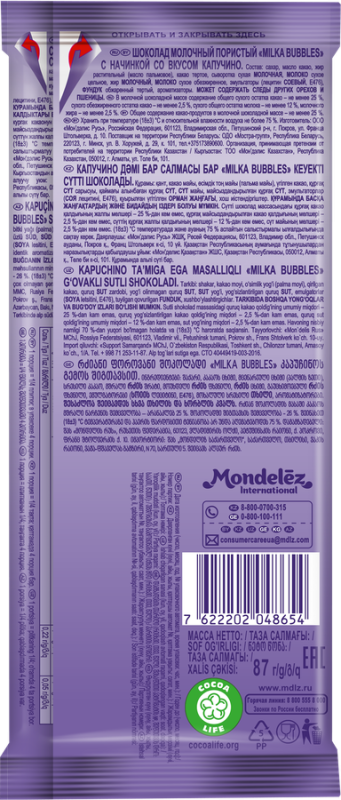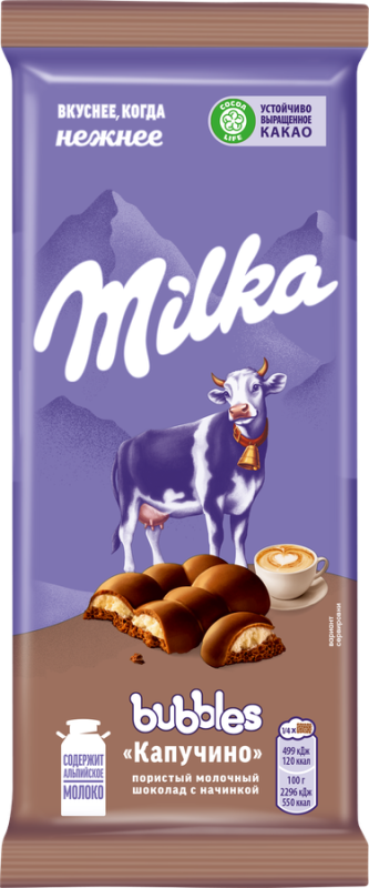 Шоколад молочный MILKA Bubbles Пористый с начинкой со вкусом капучино ‒ это нежный пористый шоколад с изысканной начинкой со вкусом капучино. Шоколад молочный изготовлен из какао высокого качества в и содержит альпийское молоко, поэтому он тает во рту и заставляет сердце трепетать от нежности! В каждом кусочке MILKA Bubbles заключены тысячи воздушных пузырьков, которые раскрывают всю нежность молочного шоколада. Фирменный вкус шоколада Milka дополняет начинка «капучино» с ярким вкусом и сливочно-кофейным ароматом. Шоколад пористый добавит нежности в будни: начните утро с кусочка MILKA Bubbles, возьмите шоколадку с собой на перекус или оставьте ее на вечер, чтобы насладиться любимым вкусом в спокойной обстановке. Шоколад станет отличным угощением к чаю и кофе, подойдет для просмотра фильма или уютного чаепития. Шоколад MILKA ‒ это не просто сладость к чаю. Это отличный повод поставить дела на паузу и уделить внимание близким. Преподнесите шоколадку в подарок второй половинке или близкому человеку, чтобы вырази