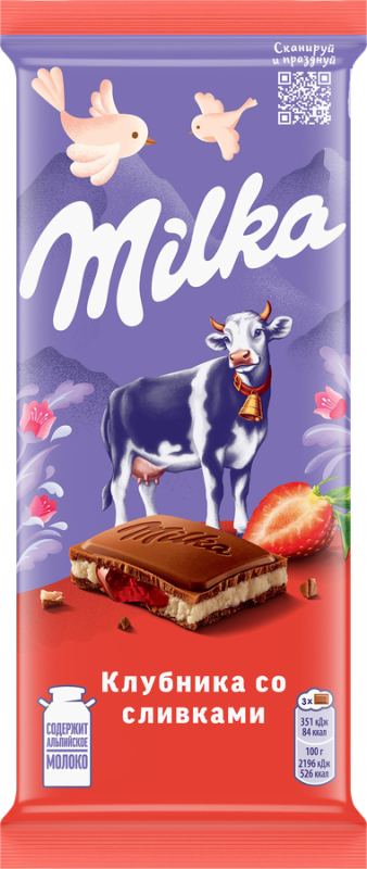 Шоколад молочный MILKA с клубнично-сливочной начинкой ‒ это двухслойная начинка: клубничная начинка и сливочная начинка сочетают сразу два вкуса: воздушный сливочный слой и клубничную начинку. Вкус, который захватывает с первого кусочка! Шоколад молочный MILKA, изготовлен из какао с добавлением настоящего альпийского молока: поэтому он обладает такой нежной текстурой и буквально тает во рту. Шоколад MILKA «Клубника со сливками» подходит не только к чаю или кофе: его можно взять с собой на работу, учебу, в поездку или насладиться нежным вкусом за просмотром любимого фильма. Дарите своим близким нежность вместе с шоколадом MILKA!
