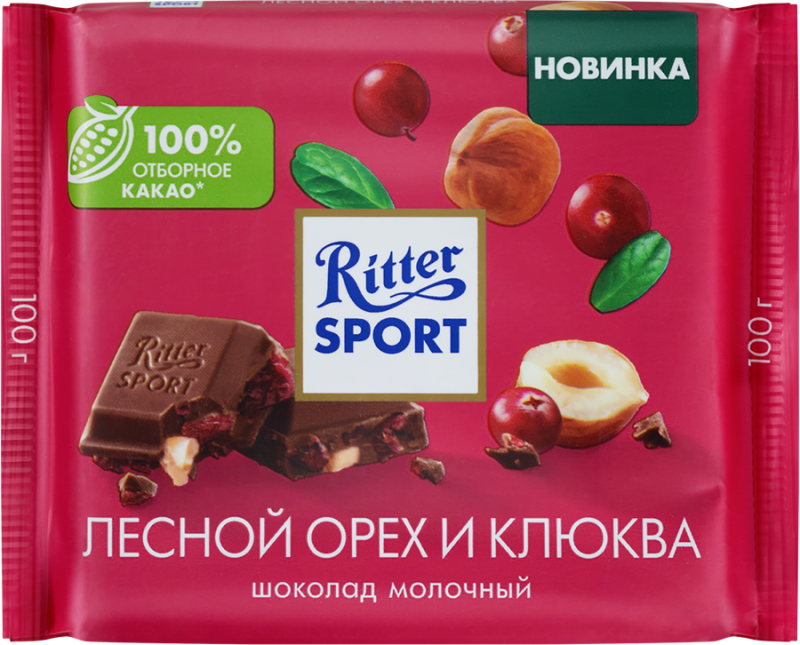 Шоколад молочный RITTER SPORT с кусочками клюквы и орехом лещины, 100г