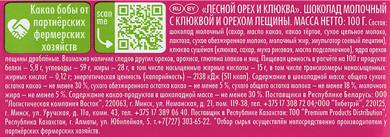 Сахар, кусочки клюквы (клюква, сахар, рисовая мука, масло подсолнечное), масло какао, какао тертое, сухое цельное молоко, лактоза,орех лещины дробленый, сухое обезжиренное молоко, молочный жир, эмульгатор (соевый лецитин). Возможно наличие следов арахиса, другихорехов, содержащих глютен злаков и яиц. Содержание в шоколадной массе: общего сухого остатка какао: не менее 30 %, сухогообезжиренного остатка какао: не менее 5 %, сухого обезжиренного остатка молока: не менее 18 %, молочного жира: не менее 5 %.Содержание какао-продуктов в шоколадной массе: не менее 30 %.