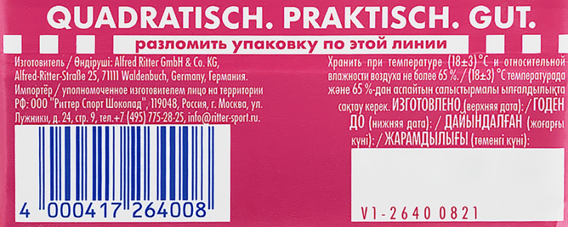 Шоколад молочный с кусочками клюквы и орехом лещины от бренда RITTER SPORT – это ароматный шоколад, приготовленный по особому рецепту с добавлением ореха и клюквы. Полезный продукт, богатый витаминами и микроэлементами. Вкусный десерт идеально дополнит утреннюю чашечку капучино или бодрящего чая.