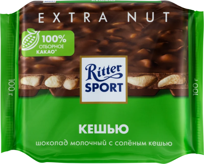 Молочный шоколад RITTER SPORT с кусочками соленого кешью приготовлен с любовью по фирменному рецепту. Сегодня шоколад RITTER SPORT знают и любят во всем мире, ведь он отличается превосходным вкусом.