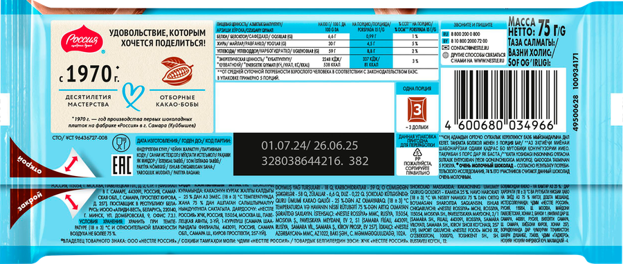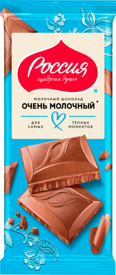 Шоколад молочный РОССИЯ ЩЕДРАЯ ДУША Очень молочный – это изысканный десерт с нежными сливочными нотками. Ароматная сладость позволит вам насладиться этим десертом в любое время и в любом месте. Его удобно брать с собой для перекуса на работу и на учебу. Такое лакомство – прекрасный выбор для тех, кто ищет подарок ценителю настоящего и вкусного лакомства.