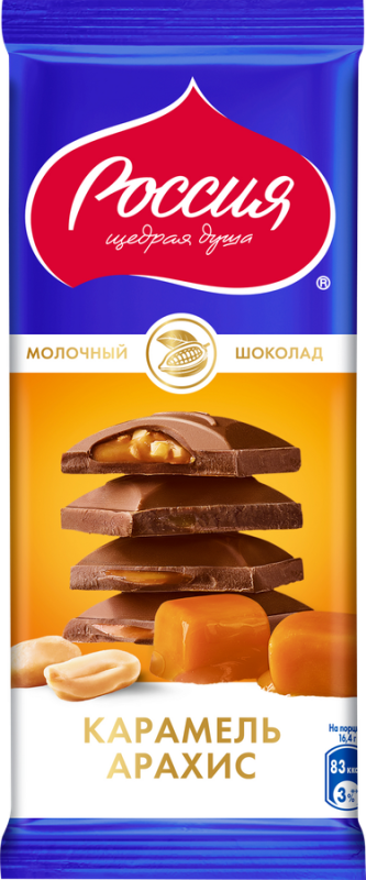 Шоколад молочный РОССИЯ ЩЕДРАЯ ДУША с карамелью и арахисом – шоколад, созданный из отборных ингредиентов. Изысканное сочетание нежного молочного шоколада и густой карамели с добавлением отборного арахиса в одной плитке.
